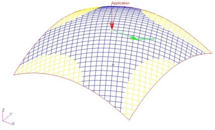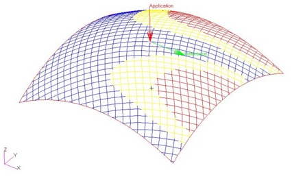 working to limit the shear, as a skilled operator would do. Geodesic propagation mode extends principal geodesic lines from the Seed Point to the ply boundary (or the boundary of the first order-of-drape region, if smaller) in the initial directions of warp and weft yarns. This uniquely constrains the fabric bounded by the principal fibers. If draping continues beyond this region, geodesic fibers are extended as required in warp and weft directions from points closest to the principal fibers until the surface is covered. This propagation type gives good results on surfaces of low curvature, but can lead to excessive shear for regions of high curvature. In the image below