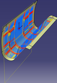 below. However, it is often necessary to define plies that lie around the bumps, but do not cover them. As most fiber simulations cannot accept holes in the surface used for simulation, the underlying surface that includes the bumps is used for the simulation, so high shear is still predicted whereas the surface excluding bumps may be rather simple and not need excessive shear. Draping result with smooth regions The smooth region is defined by an area and a curve.