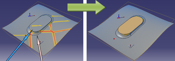 constraint and allows draping to proceed. You can force Composites Fiber Modeling to keep the fabric stuck to the order of drape regions during subsequent extensions if Inadmissible Mode is set to Cut. In this case, kinematically inadmissible fibers are avoided by automatically generating a rough cut in the middle of a bounded length in an over-constrained fiber, such as that shown in red in the figure above. This cut will only be created if the strain required in the fiber to allow it to conform to the surface exceeds the inadmissible tolerance value set, or the displacement mismatch at the cut location exceeds half a step length in the appropriate direction. This approach has the advantage of keeping the flat pattern in an order of drape region constant during subsequent draping, but forces you to define a dart to specify the flat pattern shape around the dart accurately. This methodology is recommended for highest accuracy on components like curved frames where it is impossible to avoid concave order of drape boundaries. Seed curve and order of drape can be combined if required, but the seed curve (and seed point) should lie in the first order of drape region. Smooth RegionsA smooth region is an area where the simulation can ignore awkward bumps/hollows for an initial global simulation. The subsequent local draping goes from the smooth region boundary towards the middle of the bumps/hollows Many composite structures contain "bumps" - a ubiquitous example