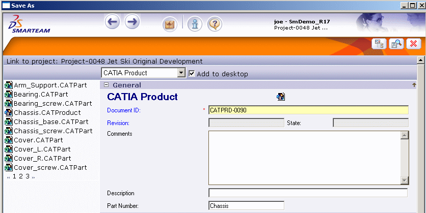 allows you to return to the initial dialog box. SmarTeam shows the profile card corresponding to the CATProduct document. In our scenario, five parts are to be saved.