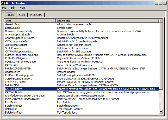 The CATDMUUtility is a batch process enabling the generation of cgr, 3dmap, hcg, wrl and NCGM formats from a CATIA file or from a MULTICAD file. It can also process files accessed in a PDM database, e.g. ENOVIAVPM or ENOVIA V5 VPM. | |
