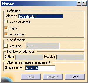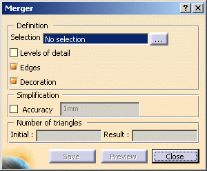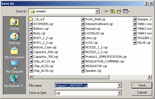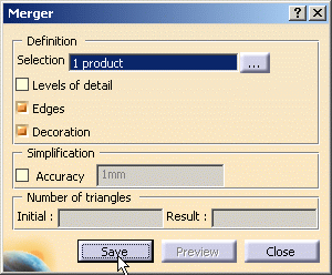 the merger functionality that is available in interactive mode. The result of this operation can be saved in cgr, VRML, CATIA V4