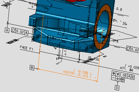 The tolerancing object of the specification tree and the surfaces used in the tolerancing annotation are highlighted. Selecting a tolerance is a way of querying the annotated model. |