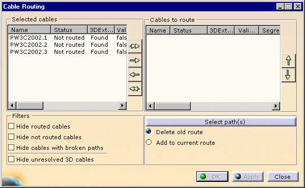 | Note: If one cable only is selected, a default path is