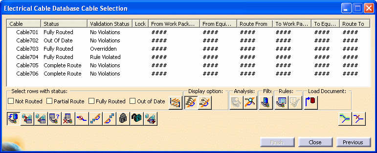 Click Previous to return to the Electrical Cable Database Cable Selection dialog box. You now can route the cables you loaded from the ENOVIA database. For detailed information, see Routing Cables from the Database. |