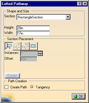 | 2. | Select a section type and enter values for height and width, or radius. You can have more than one section type in a lofted pathway. | |