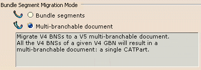 If this option is selected, all the BNSs of a V4 GBN are migrated to one multi-branchable document in a V5 geometrical bundle. All the V5 bundle segments are stored in a single CATPart, the multi-branchable document.