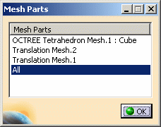 This task shows you how to use the Select Mesh Parts button available in several dialog boxes of the Generative Structural Analysis workbench. When a geometrical support is selected, this button allows you to choose one mesh part between all the activated or deactivated mesh parts associated to this support, and so, to apply pre-processing specifications (Restraints, Loads, Masses, Analysis Connections) to a transformed mesh part. |