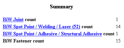 | The BiW Fasteners report opens. It displays: |