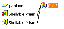 Feature_Modifier.CATPart document. The part has four Shellable Prisms. You will add 3 Feature Modifiers (3 Cuts in this example) |