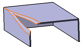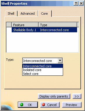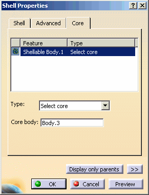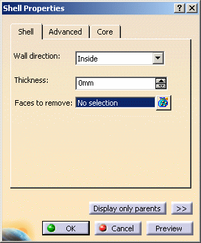 After a shellable volume is shelled, only features that have behaviors that function within internal volumes, such as ribs, can penetrate the shell (or internal) boundary. Thus, features such as boss and reinforcement cannot penetrate the shell because their behaviors are to add material volume to the outside of another material volume. Shell Update AssistantIn some specific cases, the application cannot create non-offsetable surface in the shell computation. An error message then appears informing you that the resulting geometry cannot be assembled. These errors are difficult to manage by the user because they generally involve several shellable features and the shell properties. The Shell Update Assistant is to help the user identify the cause of an update error in the shell computation and then to solve the error. Core (Specific to Inside wall direction)The Shell Update Assistant is a new tab, labeled Core, that is added to the Shell properties dialog. It displays the list of shellable features and how each contributes to the inner shape of the shell. In case of an update error in the shell property, the Shell Update Assistant allows the user to quickly identify which shellable feature(s) caused the error, to activate or deactivate shellable features, to change their core contribution type, and to try another update. There are