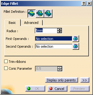 Advanced OptionsSelecting Advanced tab displays two additional options: Edges to keepWhen filleting an edge, depending on the radius value you specified the fillet may affect other edges of the part that you do not want to fillet. In case you can anticipate such a result, before confirming the Fillet operation, specify the edges you want to exclude from the operation by selecting in the Edge(s) to keep box. Limiting ElementsThe Limiting element option lets you intersect the fillet with one or more planes. You can use the contextual commands available for creating limiting elements by right-clicking in the Limiting element box. You can select points as limiting elements. These points must be located on the edge to be filleted and they must have been created using the On curve option available in the Point Definition dialog box. Trim RibbonsYou can trim the fillets to be created by selecting the Trim ribbons check box. Conic ParameterThe Conic Parameter option allows you to vary the section
