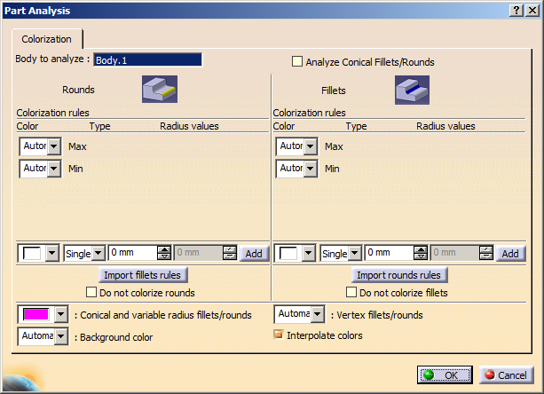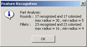 To know how to display the different categories of fillets and rounds according to their different radius values, refer to Analyzing the Fillets and Rounds of a Part. |