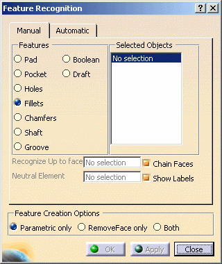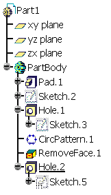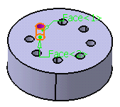 For example, as shown in the first scenario, if you have a pattern of holes and want to edit only one or two holes out of it, then you can re-specify that hole with Part Rework. The new hole definition is available if you want to edit it. Part Rework is shown in manual mode in this task but it is also available in local feature recognition mode. |