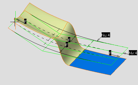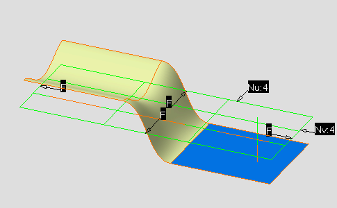 A patch with control points and mesh lines is displayed. It represents the planar patch, defined in the plane indicated by the compass, equivalent to the same bounding box as the selected surfaces. |