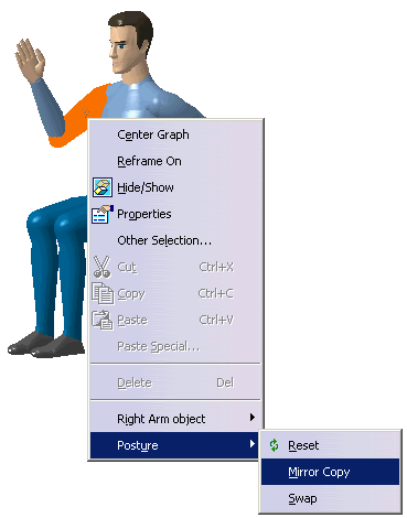 The mirror copy functionality copies the selected posture onto the equivalent segment on the opposite side of the manikin. For instance, it copies the posture from the left arm to the right arm. This helps in creating symmetrical postures.