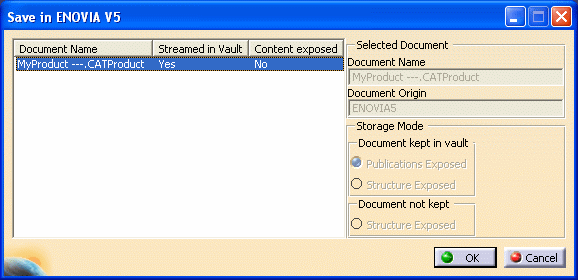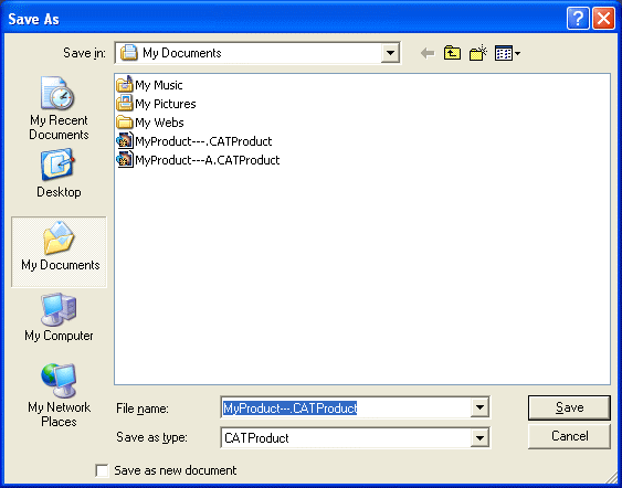But you must keep in mind that the end of the file name will not be interpreted as an ENOVIA V5 VPM revision if you save this file back to ENOVIA V5 VPM (thus creating a new ENOVIA document). Unless you change the name in the Save in ENOVIA window, the new document name will be as follows: