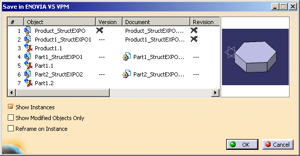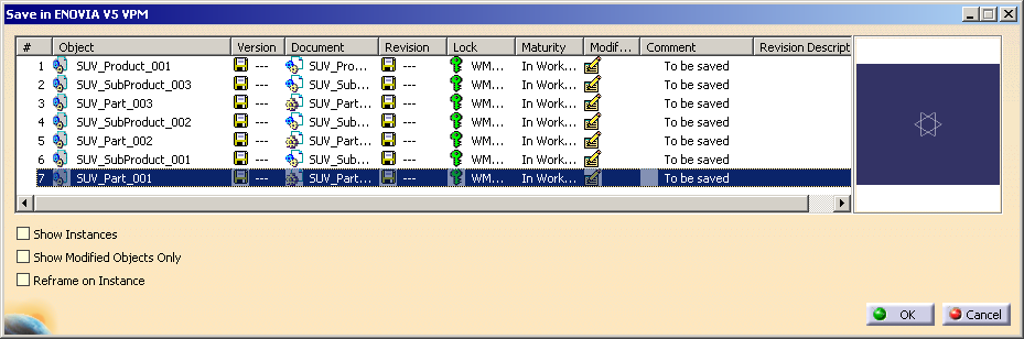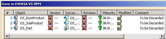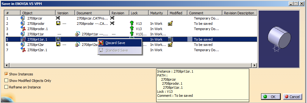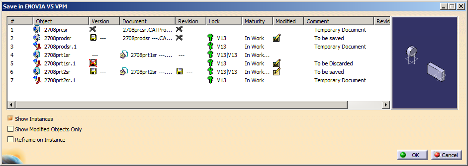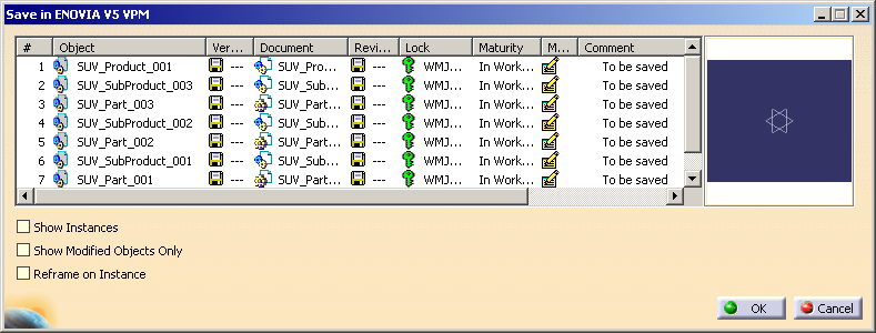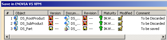 The Save in ENOVIA V5 VPM dialog box appears. The modified object with
