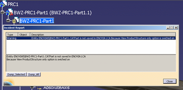 The objects are listed in the Save in ENOVIA V5. For each modified (or new) object, a specific message is displayed in the Incident Report toolbox to inform the user that the object named XXX is not saved in ENOVIA V5, because the View Product Structure only mode is active. The same specific message is displayed for: