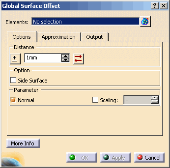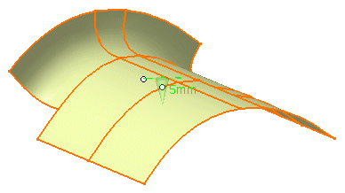 | The offset direction corresponds to the normal direction of each patch. The system tries to combine the selected surfaces to form common areas, and to keep the transition qualities as far as possible during the offset computation. If required, the offset surfaces are trimmed or extrapolated |