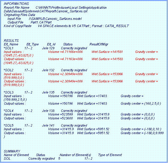 The following section describes the usage of the V4/V5 BREP Info Checker. During the copy/paste of a SOLID E, a migration report is delivered containing the geometry values: the Volume, Wet Surfaces and Gravity Center properties of the V4 model and the V5 CATPart. The V5 unit is chosen. | |