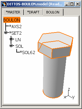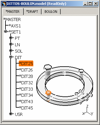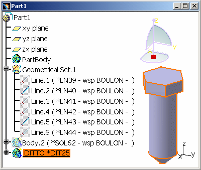 In Geometrical Set.1, there is the geometry of DIT25 which has been copied only once. The DETAIL is the first migrated element; you can visualize it in the Specification Tree, it is called Body.2(*SOL62-wsp BOULON-). The DITTO appears further down in the Specification Tree; it is called CARWL of Body.2 (*SOL62-wsp BOULON-). The DETAIL BOULON (*SOL62-wsp BOULON-) remains its reference. In the Specification Tree, the Body of the DETAIL appears before the DITTO because it is a reference for the DITTO. The DETAIL is not the main object of the CATPart which explains why the PartBody is empty. |