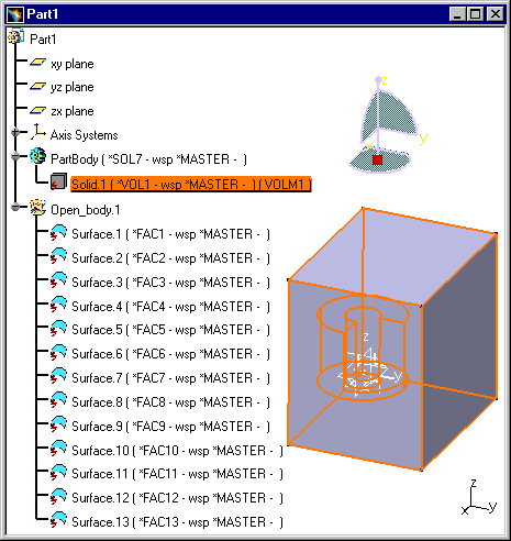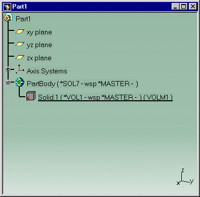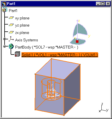 The Exact Solid, *SOL7, belongs to a Volume, *VOL1. A Volume is the parent of a Solid. If you copy/paste a *MASTER containing a Volume and a Solid into CATIA V5, only the Solid is copied. As a consequence there are fewer features and there is more geometry. Volumes, Faces and Solids are in the Show space. Volumes, Faces and Border Curves are not migrated because they are filtered, but it is possible to select equivalent features such as Edges, Boundary Curves. |