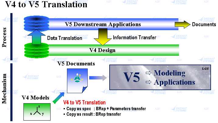 Migration or Transformation covers the following Aspects:A V4 environment to be converted into V5 : V4 to V5 TranslationHaving acquired CATIA V5 recently, a design department has to launch a new project based on legacy data for modification. For this reason they need to convert former V4 data into V5 data. This Direct Transformation can take place with the Copy As SPEC (Boundary Representation + Specifications) and Copy As Result (Boundary Representation) mechanisms. |
