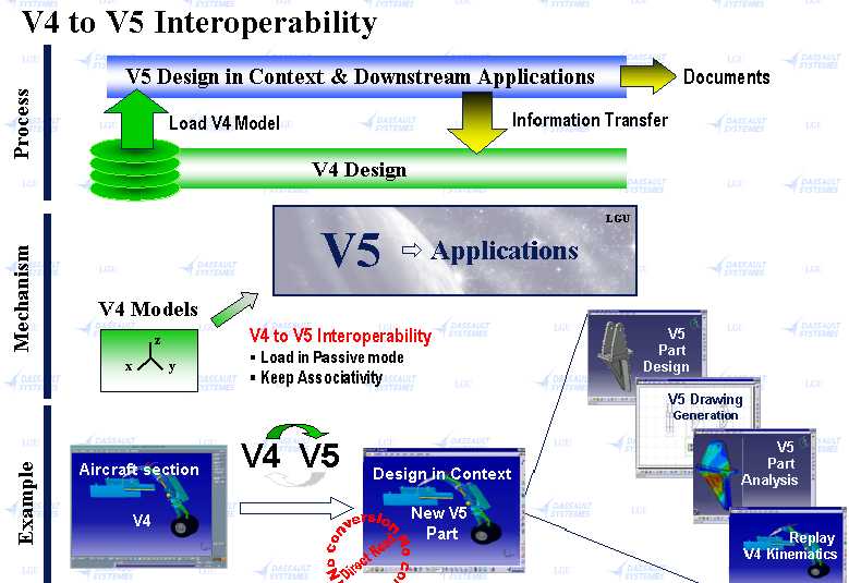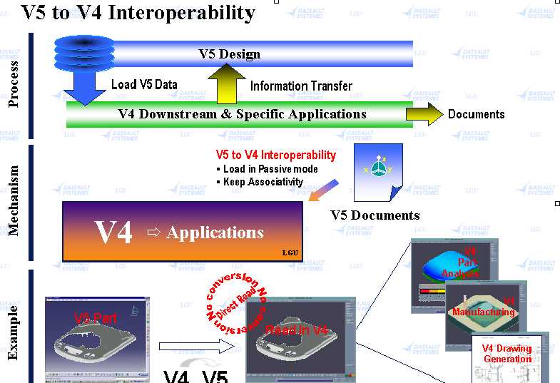 V5 Data Usage in V4 Context: V5 to V4 InteroperabilityFor instance, an enterprise is not yet working with CATIA V5, and it is however using V5 documents (Master Geometry) in the context of V4 applications. This reverse Interoperability is nowadays used by Manufacturing. |