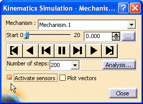 The Kinematics Simulation -Mechanism.1 dialog box is displayed.