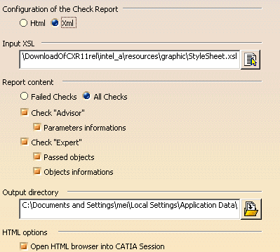To generate a html report when performing the check analysis, go to Tools>Options>General>Parameters and Measure, and select the Report generation tab. Select Html in the Configuration of the Check Report area.