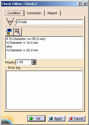 The message you type in the Correction Comment area will be displayed in the report generated when you click the Report icon of the workbench. It will also be displayed if you right-click the check in the specification tree and select Correction function