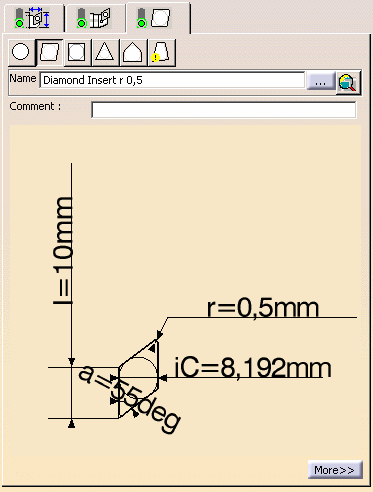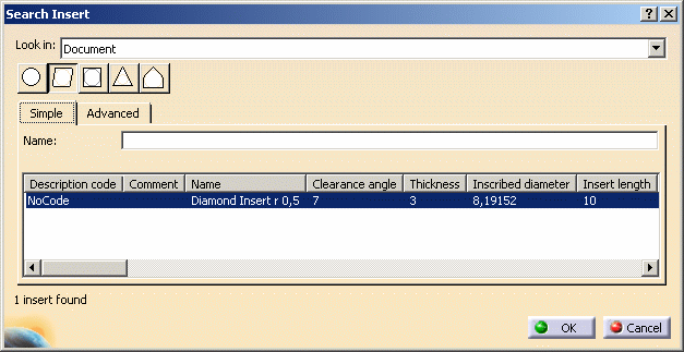 More About Editing InsertsCompatibility Between Insert and Insert HolderCompatibility is checked between the insert and the insert holder. If there is incompatibility, this is indicated by an exclamation mark symbol on the icon. In the example below, the selected diamond insert