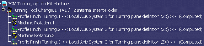 Define your turning operations in the corresponding local axis systems, then generate Machine Rotation instructions in the program using the command Generate Machine Rotation command.
