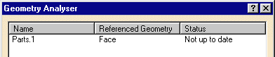 Bottom). The second column lists the names of the referenced geometries: Edge, Face, and so on. The third column lists the geometry status: Up to date, Not up to date, or Not found. The columns of the Geometry Analyser dialog box can be sorted by clicking on the column header. Multi-selection is possible. |