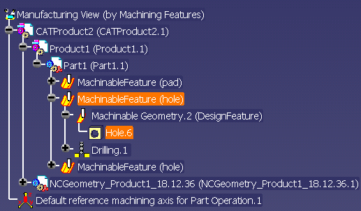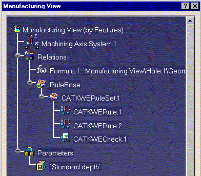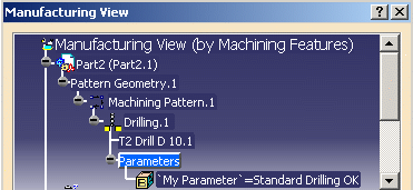 Parameters can be added on machining operations and features in the Knowledge Advisor workbench. In this case the Manufacturing View sorted by Machining Features displays a generic node named Parameters under the machining object node. Under this node the parameter node appears with its name, its value and/or its formula (depending on the Knowledge parameter display setting).