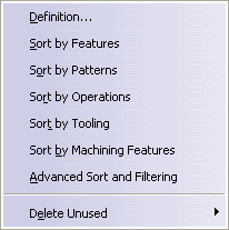 You can use Delete Unused > All Machining Features to delete all unused machining features. Alternatively, you can delete all unused features of a chosen type (Machining Patterns, Prismatic Rework Areas, Machinable Area Features, and so on). |