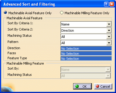 Advanced Sorting and FilteringThe Advanced Sort and Filtering contextual command lets you sort and filter Machinable Axial Features and Machinable Milling Features by means of the Advanced Sort and Filtering dialog box. Cumulative sort and filtering capabilities are available based on geometry criteria (Direction, Faces, and Feature Type), machining status (Machined/Not machined), and so on. Machinable Axial Features are axial features created by Prismatic Machining Preparation Assistant, Machinable Area features created by DPM Machining Process Planner, and Machining Patterns. Machinable Milling Features comprise Prismatic Machining Area and Prismatic Rework Area features. Sorting and Filtering Machinable Axial FeaturesSelect Machinable Axial Features Only in the dialog box: the Machinable Axial Features sort and filter options become available.