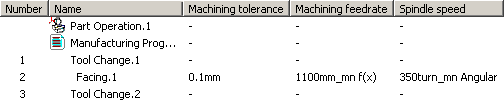 Other columns in Process Table can be used to visualize tool information: nominal diameter, corner radius/nose radius, cutting length, body diameter, and non-cutting diameter. The following parameters can also be accessed: Tool Number, Corrector Id, Corrector Number, and Radius Number. The tool number can be edited. If the Activate Collision Checking check box is set in the Part Operation dialog box, then a Collision status column will indicate whether any collisions have been detected. |