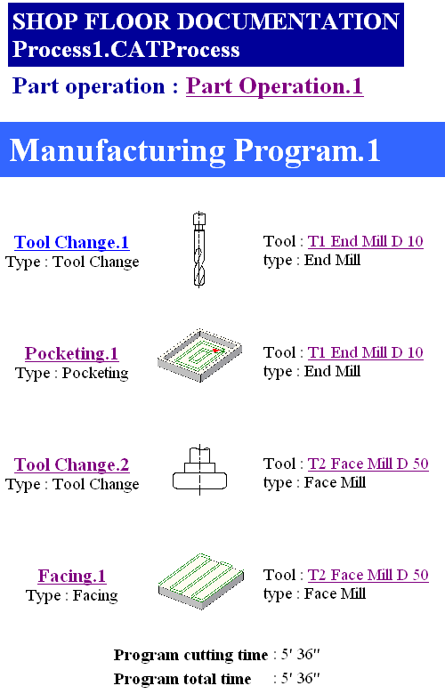 | 4. | Click OK to generate your documentation. An extract from a Sample Shop Floor Documentation delivered with this User's Guide is given below. Please note that the documentation can include machining times for machining operations and manufacturing programs. |