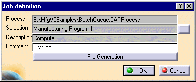 The Job Definition dialog box appears allowing you to select either a program or part operation in the Process List by means of the [...] button. Two options are possible: