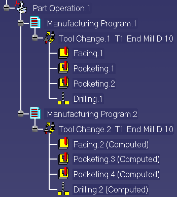 The second program has also been computed and the resulting tool path is synchronized with the CATProcess. The operations in the program now have Computed status in the specification tree: |