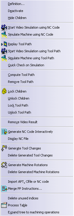 | Lock/Unlock Children | Locks all the machining operations of a program. Locked operations can be unlocked with Unlock Children. | |
