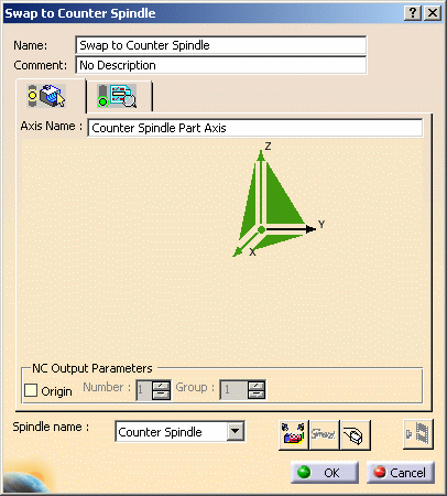 Select the Counter Spindle Part Axis machining axis and set the Spindle name to Counter Spindle, if this is not already the case. Click OK to confirm your modifications to the operation and quit the dialog box. |