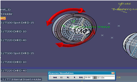Spindle rotation is shown for Lathe Machining Operations and Axial Machining Operations with fixed tool. The below image shows spindle way of rotation during Tool Path Replay. ![]() If a spindle is involved simultaneously in more than one activity with different ways of rotations, the spindle arrow is displayed in red color with two arrow heads indicating both clockwise and counter-clock wise directions as shown in the image below (Time Based Replay). ![]() Spindle direction display is not supported during Time Based Video simulation. |