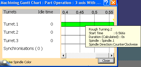 This task shows how to get information on spindle associated with a Machining Operation by placing pointer on the Machining Operation node in PPR tree or on a bar (associated to the Machining Operation) in Gantt chart. | |