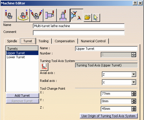 Turning Tool Axis System defines the turret plane, which allows realistic representation for: