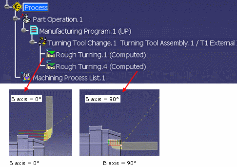 B axis move is simulated according to the tool axis defined on the turning operation.