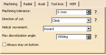 The Reverse Direction button lets you reverse the direction of the axis with respect to the coordinate system origin. The item Analyze opens the Geometry Analyser. Multi-Axis Spiral Milling: Machining Parameters