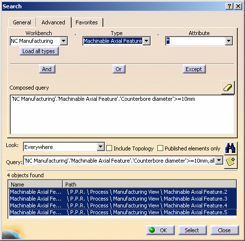 machinable features by means of search criteria. Features selected in this
